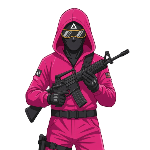 a guard wearing a hot pink hooded jumpsuit. the face is completely covered by a glossy black mask with one large solid white triangle in the center. no other symbols or patterns. black gloves and black boots. holding a black rifle with both hands in a sta