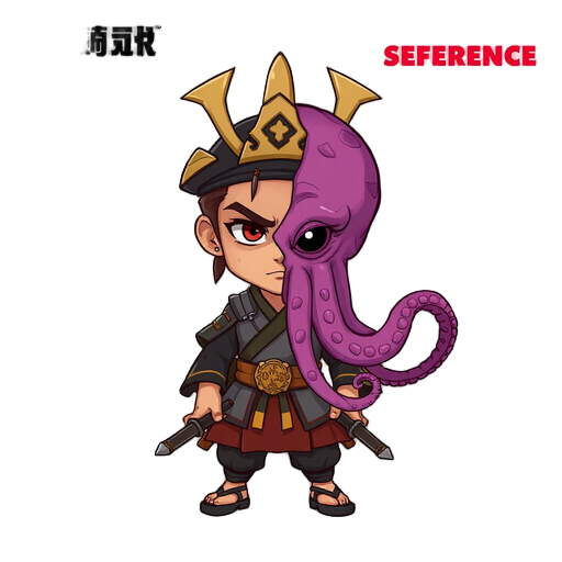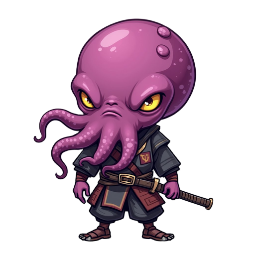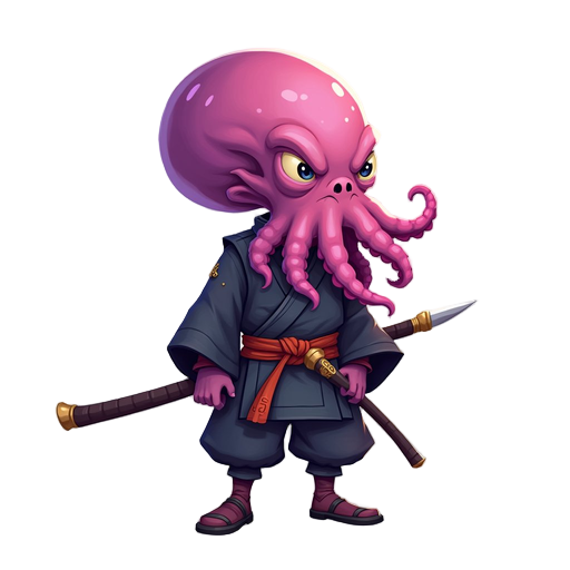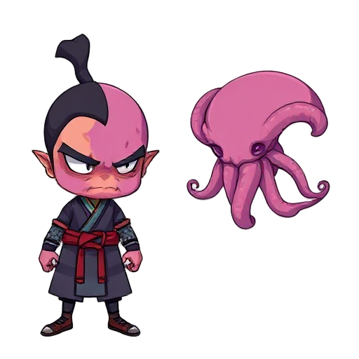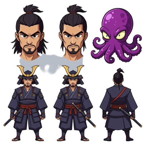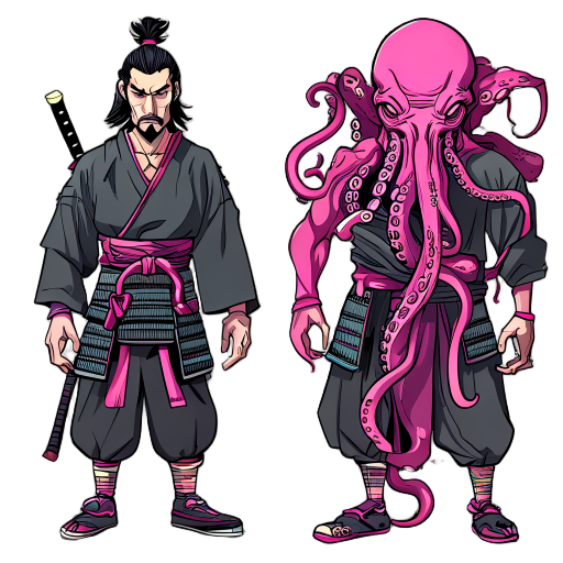 this is a character concept sheet / sprite reference for a 2d game, featuring a samurai whose right half of the face (and sometimes more) has been replaced by a grotesque, pink-purple octopus alien. key visual elements: the left half of the face is a ste