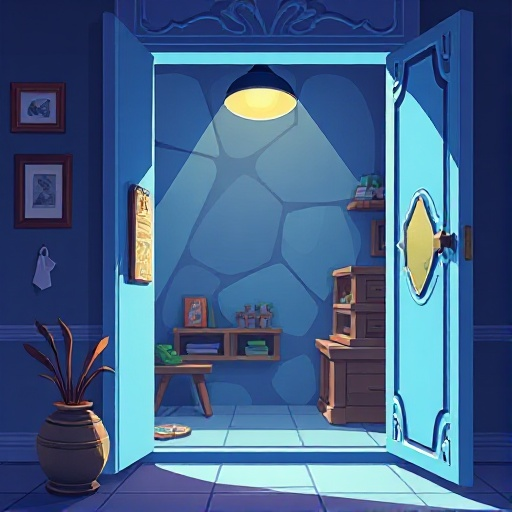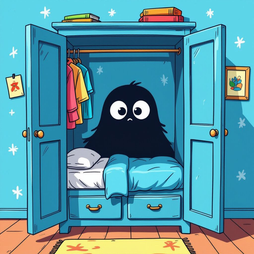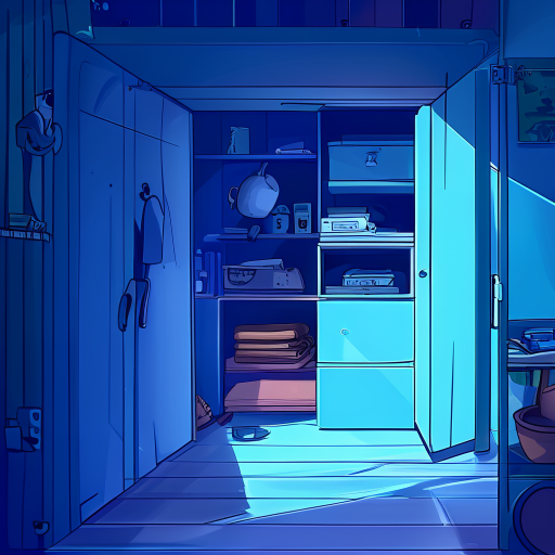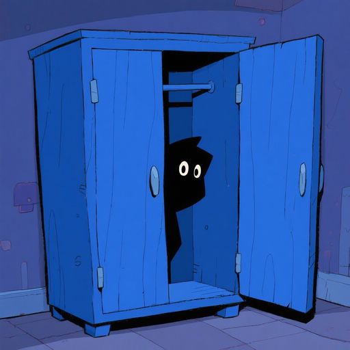 um cenário dentro de um armário azul onde dá para ver pelas frestas uma sombra olhando para dentro do armário