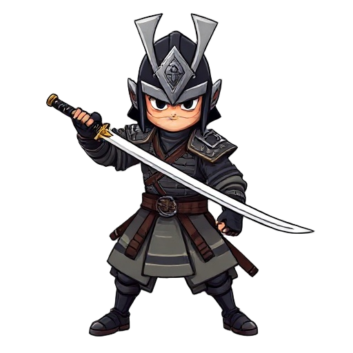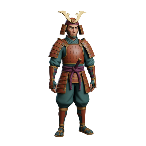 a warrior wearing the kendo-like armour but with real combat application, holding a sword in the chudan stance, the tip is pointed at the viewers throat. transparent background