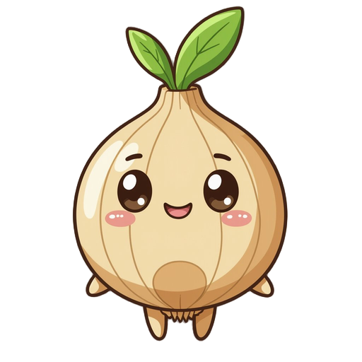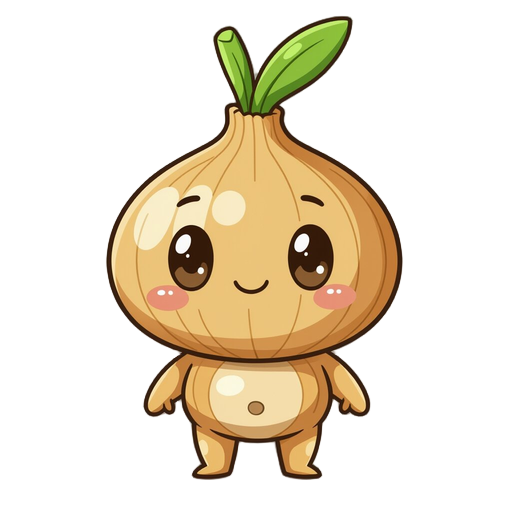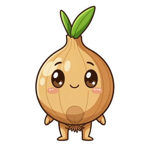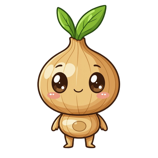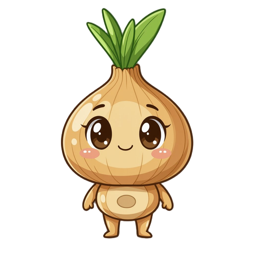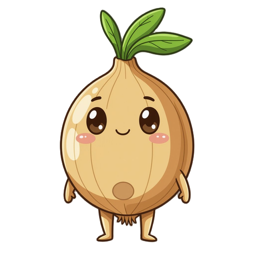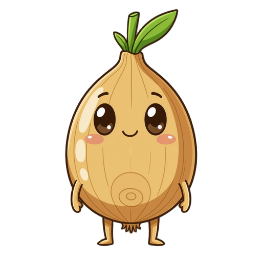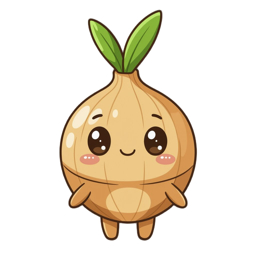chibi onion-humanoid with tan-gold body, thick dark-brown outlines, on the body is a large round bulbous onion head topped by an upright green teardrop sprout, oval dark-brown eyes, tiny line mouth, simple round limbs and a faint circular brown marking on