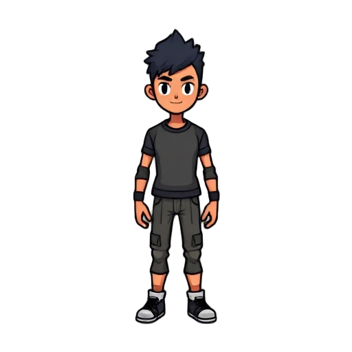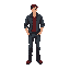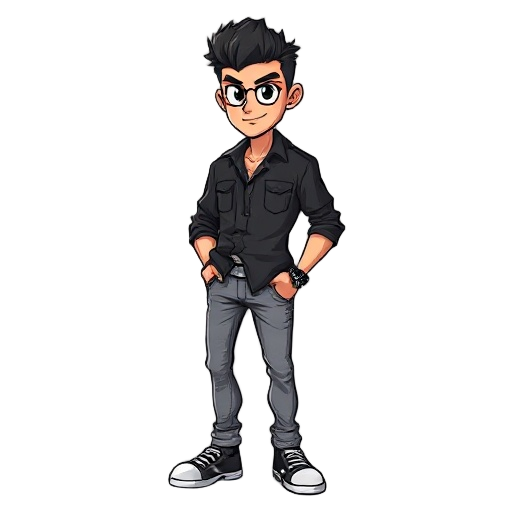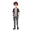 personagem de cabelo estiloso preto usando camisa preta colada e calças jeans brancas olhos casstanhos escuros