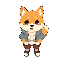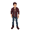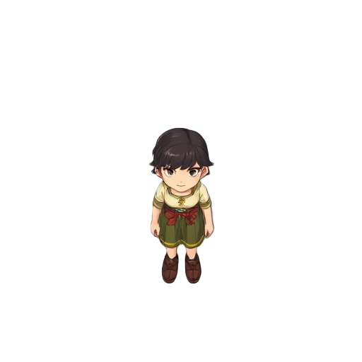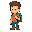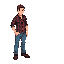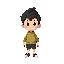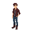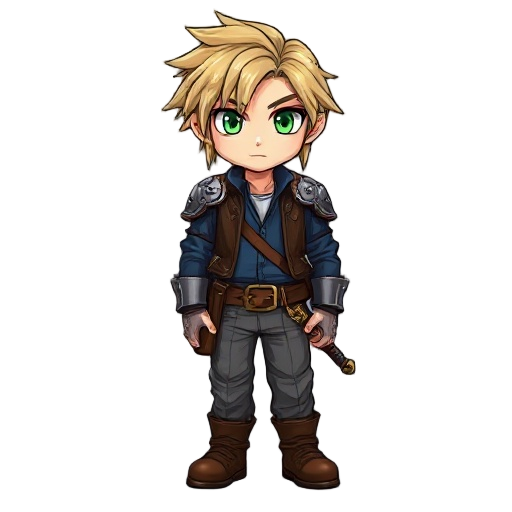 2d chibi character final fantasy 6 style. dirty blonde hair, green eyes, armor shoulder gaurds, leather jacket, blue shirt, brown belt with brass buckle, grey pants, brown leather shoes, sword in holster