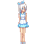tall, thin girl with long, straight white hair and a blue ribbon in her hair. wearing a light blue and white dress, wearing light blue flat shoes.