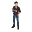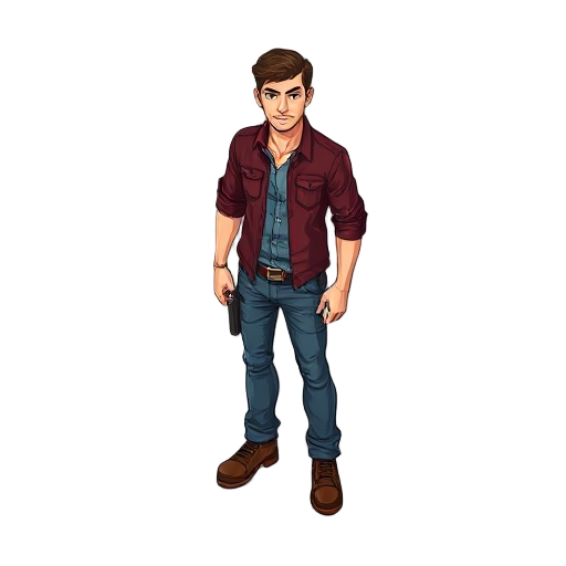 crie um personagem masculino, semelhante ao protagonista chris de resident evil, com calça jeans azul e uma camisa lisa da cor preta e bota marrom