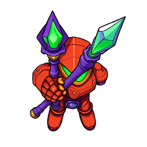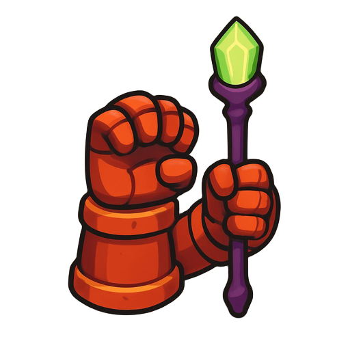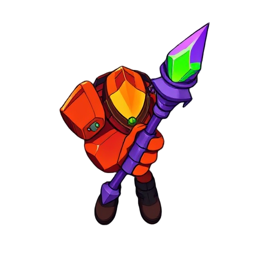 "cartoon fantasy rpg item: oversized red-orange mechanical gauntlet holding a purple wizard staff with glowing green crystal tip. game asset style, bold colors, clean outlines, gray background with shadow. digital illustration."