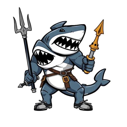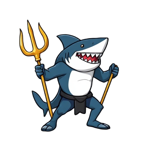 robust shark warrior, 3/4 profile, holding a gold trident ready to attack. limited palette (blue-gray, white, black, gold/silver). strong silhouette, high contrast.