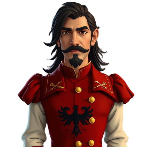retro style, middle aged man, black moustache and small black beard, fantasy land, inside castle, torch light, gloom, long black hair, wearing red middle age style doublet with black imperial eagle symbol with wings down and puffy shoulders and gold trim