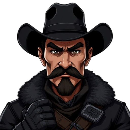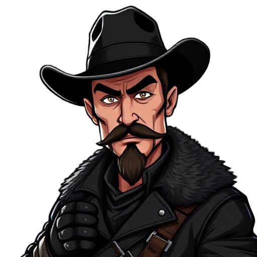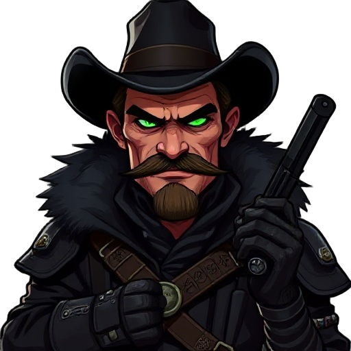 dark outlaw gunslinger with black hat, rugged face, thick muttonchops and mustache, clean-shaven chin, green-veined neck, black fur-trimmed leather coat, rune-etched bandolier, armored gauntlets, gritty detailed style.