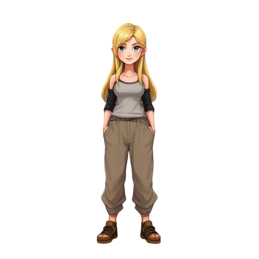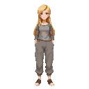 blonde woman with long hair, wearing baggy clothes