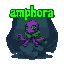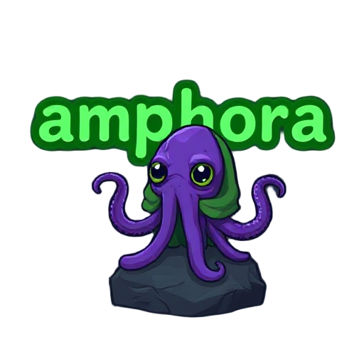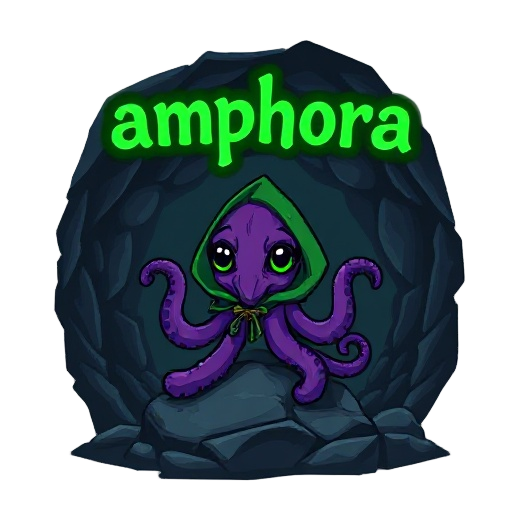 make a green title of "amphora" which has a slight glow effect, outlined in darker green, pixel, purple octopus in a green cloak with frog eyes in a underwater cave, dark, gloomy, octopus is on a rock/stone