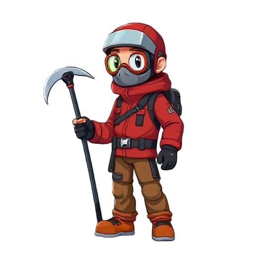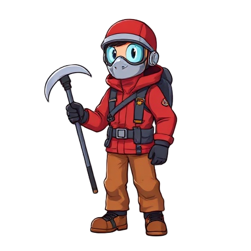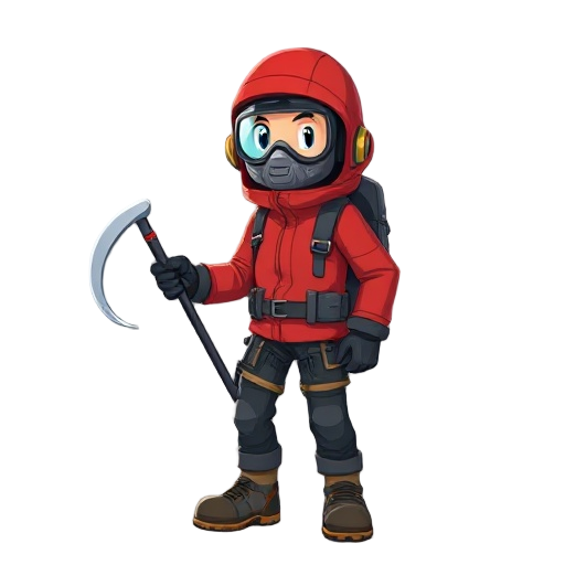 a climber in a red jacket with a mask for connecting cylinders and an ice axe in his hand