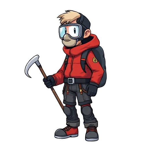 a climber in a red jacket with a mask for connecting cylinders, holding an ice axe in his hand from the side