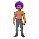 a tall, young man with tanned skin, a muscular build, and magenta eyes, accentuated by thin eyebrows and a sparse mustache. his current style includes voluminous purple hair in an afro combed back.