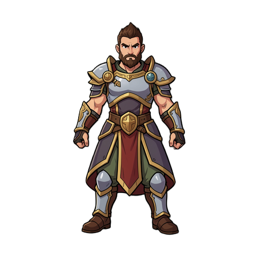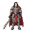 muscular knight in armor, with red cloak and very big sword in his right hand, without helmet and with long hair.