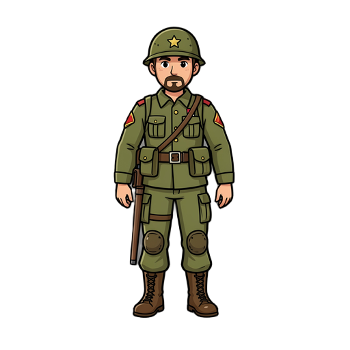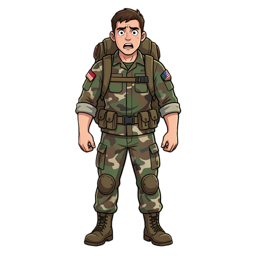 create a full character of a young caucasian military soldier. clothing should be camouflage with sleeves rolled up, strong physique, and wearing a backpack. overall look should be frightened but willing to take on danger