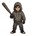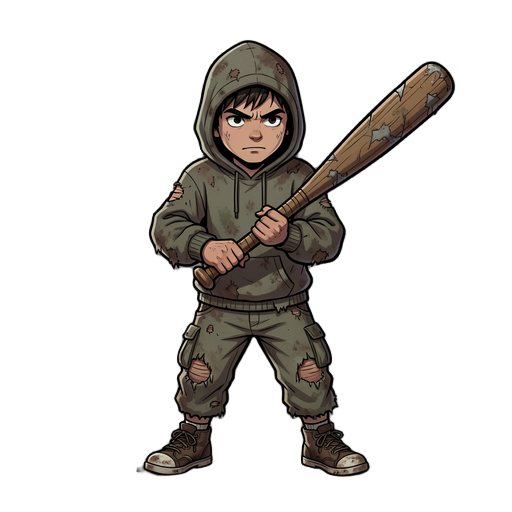 a character design of a gritty street urchin, inspired by the art style of katana zero. small, agile stature. the character is wielding a worn-out wooden baseball bat as a primary weapon. wearing basic, tattered vintage clothes: a dirty oversized hoodie,