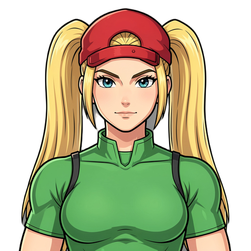 cammy white from street fighter, green suit, two long polytail, blonde, red barret cap