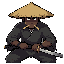 close-up portrait of a dark ronin samurai in a tattered black kimono and a traditional straw kasa hat (jingasa). he has a single piece of straw held casually in his mouth. he is in a low, aggressive pre-attack stance, both hands gripping the tsuka of his