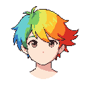 a young and delicate character, cartoon/anime style, with fair skin and large eyes without marked pupils, conveying a calm and neutral expression. he has short, messy hair with a rainbow gradient effect (blue, green, yellow, orange, and red) that spreads