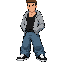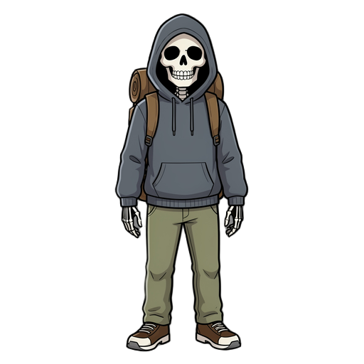 full body character sprite of a skeleton wearing human clothes. hooded sweatshirt, pants, shoes, wearing a backpack