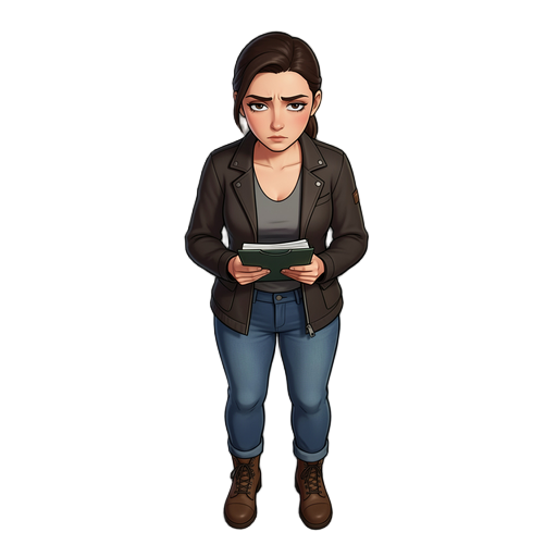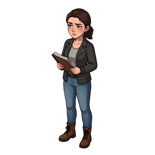 female brazilian investigator, early 30s. serious and intelligent expression, tired eyes. dark brown hair tied back, minimal makeup. wearing a dark jacket, simple blouse, jeans, practical boots. holding documents or a notebook. posture calm, analytical, o