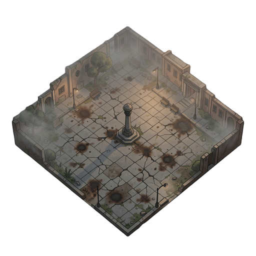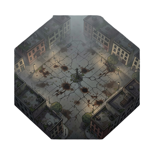top-down map of an abandoned urban square in brazil, ordem paranormal rpg style, inspired by calamidade (cellbit). realistic, dark and grounded atmosphere, no fantasy colors. old forgotten city plaza at dawn, covered in fog and silence. cracked stone pav