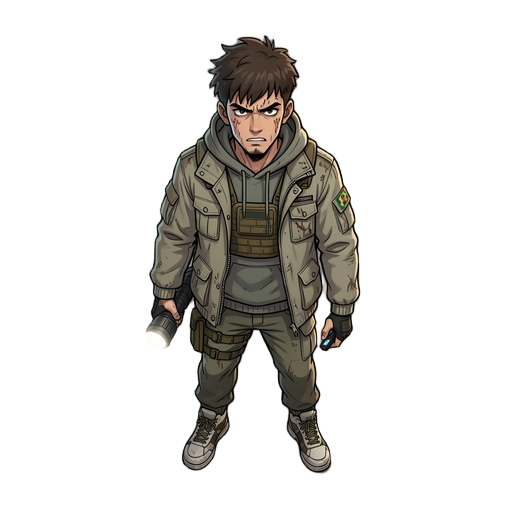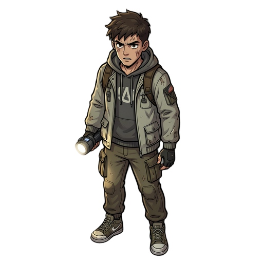 young brazilian man, mid 20s. slim build, alert posture, sharp eyes. short messy hair. urban streetwear mixed with tactical elements: hoodie, light jacket, sneakers. carrying a flashlight or small tech device. expression curious, tense, ready to react. re