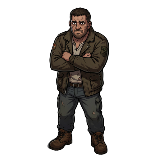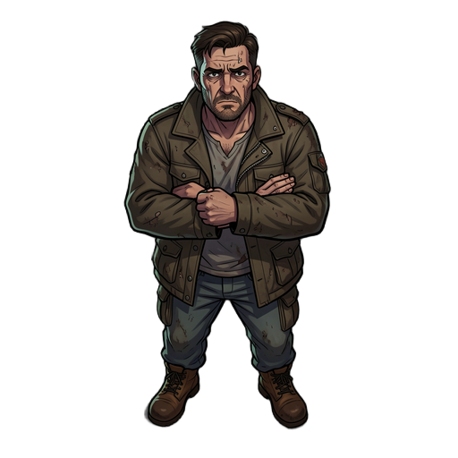 brazilian man, late 30s to early 40s. strong build, tired but determined face. short hair, stubble beard. wearing heavy jacket, worn shirt, work boots. protective stance, fists clenched or arms crossed. expression serious, protective, haunted by past. dar