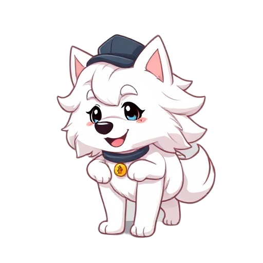 cute white fuffy samoyed with wavy hair that moves as the characater moves, intended for a side scrolling game project like a metroid or castlevania game style with support for replaceable hat. i need this character to be able to have swipe animations wit