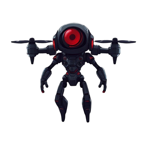 security drone, cyberpunk style, floating robot with a red scanning eye, dark metal armor with neon red details