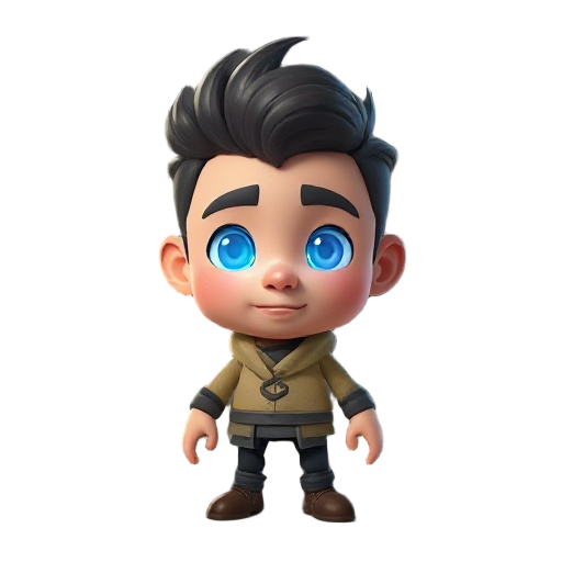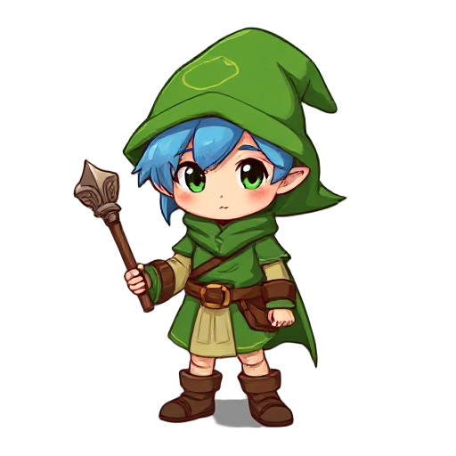 chibi style, young druid dressed in green, with a green hat, blue hair, holding a wooden wand.