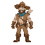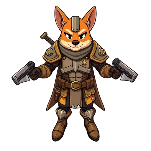 homem com armadura bobotica com leves caracteristicas de cachorro, em tons de amarelo e marrom, punhos adapitados para combate corpo a corpo, alguns pontos de encaixe de armas mas estão vazios ainda