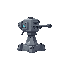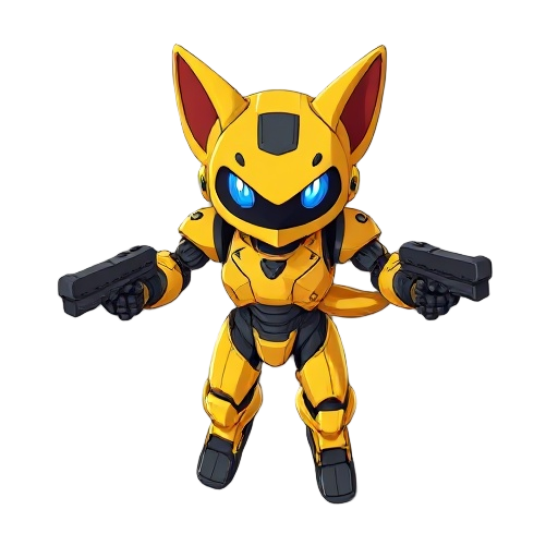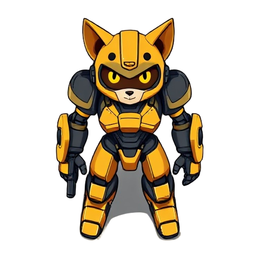 robo humanoide com leves caracteristicas de cachorro, em tons de amarelo e marrom, alguns pontos de encaixe de armas mas estão vazios ainda