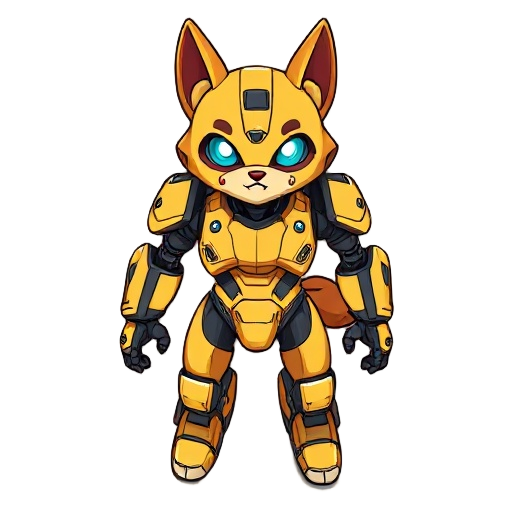 robo humanoide com leves caracteristicas de cachorro, em tons de amarelo e marrom, punhos adapitados para combate corpo a corpo, alguns pontos de encaixe de armas mas estão vazios ainda