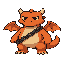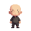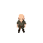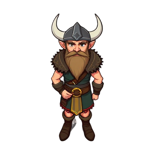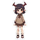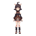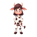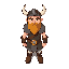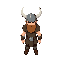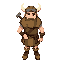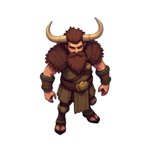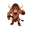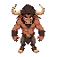 minotauro 32×32: corpo musculoso, cabeça de touro com chifres curvos, focinho largo, olhos brilhantes, pernas fortes com cascos, pelagem marrom, cauda curta e braceletes de couro. segura um machado lateralmente