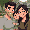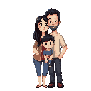create an image as if it were a portrait of a woman with black hair together with her husband and a small child. the husband should have clearly masculine features. they should appear as a close family, posing warmly. include a background that looks like