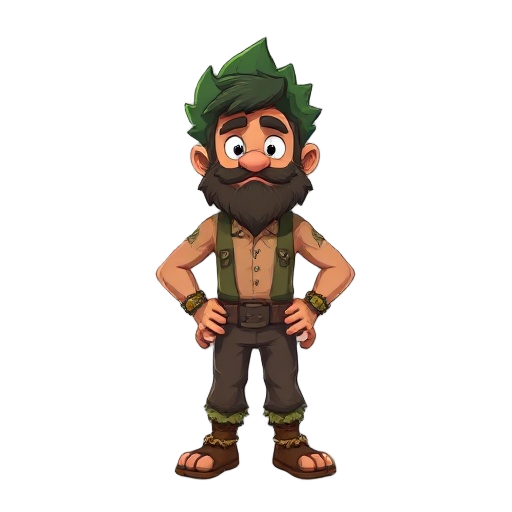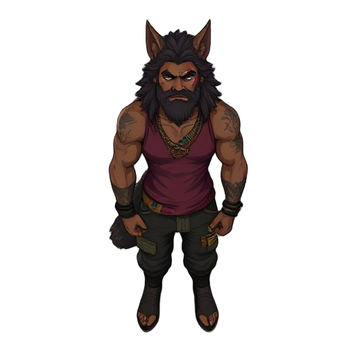 octopath traveler 2 style of an afro-descendant beastman. muscular, with wolf ears and tail. has dreadlocks, a beard, a scar over his right eye, and multiple body scars. wears a wine-colored tank top and black cargo pants.