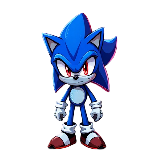 "rewrite sonic.exe, versión corrupta y oscura de sonic, con pelaje azul desgastado y líneas de código brillando bajo su piel, ojos rojos distorsionados con símbolos y glitches digitales, sonrisa siniestra, fondo sombrío con neón y sombras distorsionadas,