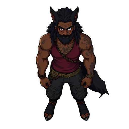 octopath traveler 2 style of an afro-descendant beastman. muscular, with black wolf ears and tail. has dreadlocks, a beard, a scar over his right eye, and multiple body scars. wears a wine-colored tank top and black cargo pants.