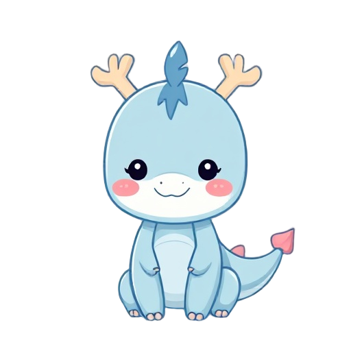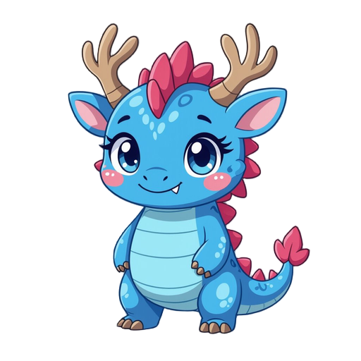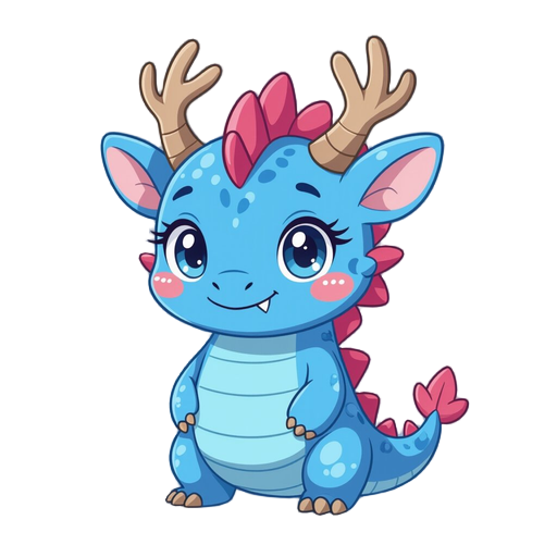 cute chibi blue dragon mascot with a round head and body, pastel blue color, light blue belly, tiny deer-like antler horns, pink blush cheeks, small oval eyes, small fangs, simple curved whiskers, short legs, small tail with pink tip, kawaii style, minima