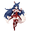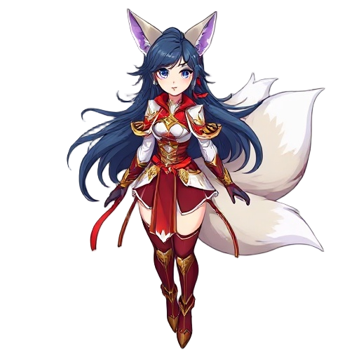 a dynamic female fox-spirit character with long flowing dark-blue hair, fox ears, and a large fluffy white tail with light purple accents. she wears an elegant fantasy outfit combining red, white, and gold tones—stylized armor mixed with a short dress, th