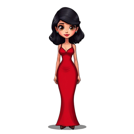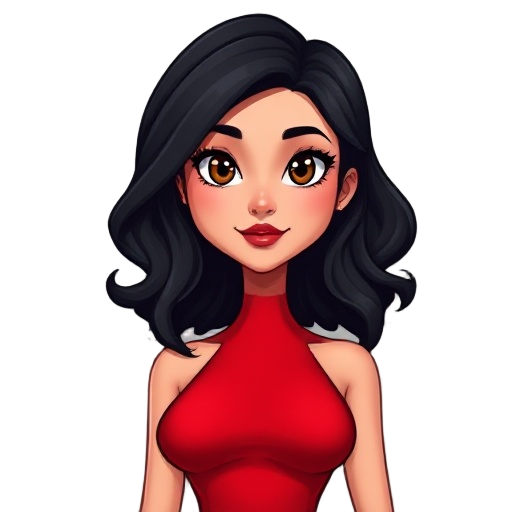 a stunning woman with black, wavy, mid-length hair and hazel-brown eyes, wearing a fitted long red dress