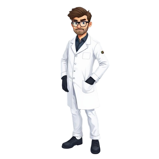 a tall, white-clad scientist wearing glasses, protective gloves, and black shoes. the image has a realistic style against a transparent background.
