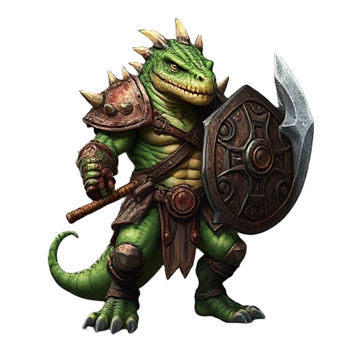 reptilian humanoid warrior, muscular, green scales, heavy rusted armor with bone spikes, large shield-shell on one arm, massive double-bladed axe in the other, brutal fantasy rpg style, detailed textures, full body, centered, transparent background