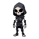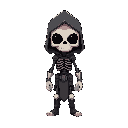 caveira juvenil, baixo e com uma cabeça grande, com um olhar vazio, inexpressivo, ossos brancos amarelados, desgastados, sem nenhuma veste ou arma