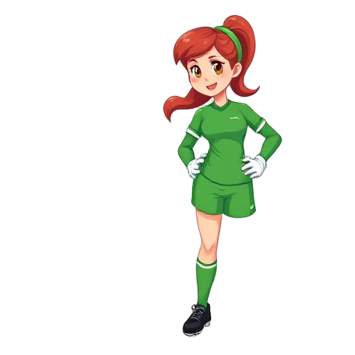 female goalie character sprite, vector illustration. red hair, ponytail, green headband. full body green soccer kit, white gloves, black cleats. cute cartoon style, flat design with soft shading, game asset, isolated on plain background.