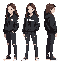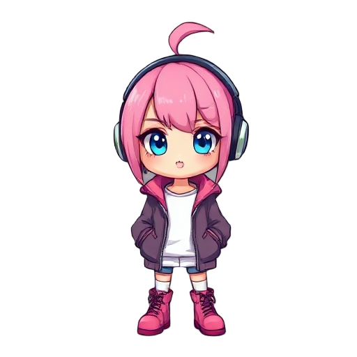 female character with pink hair, blue eyes, unzipped hoodie revealing white shirt inside, pink boots, wearing headphones