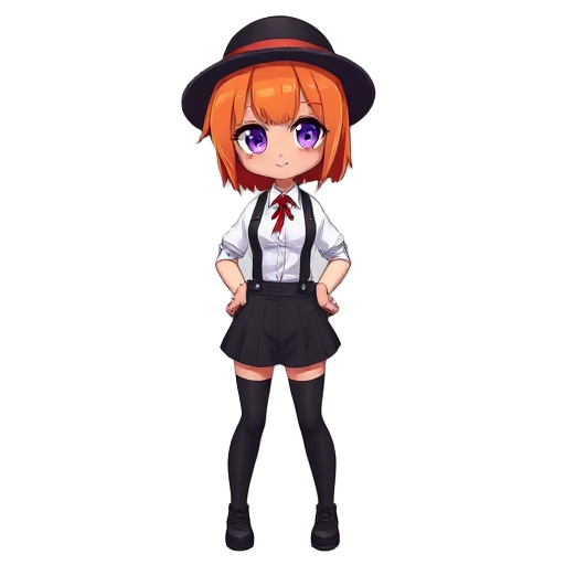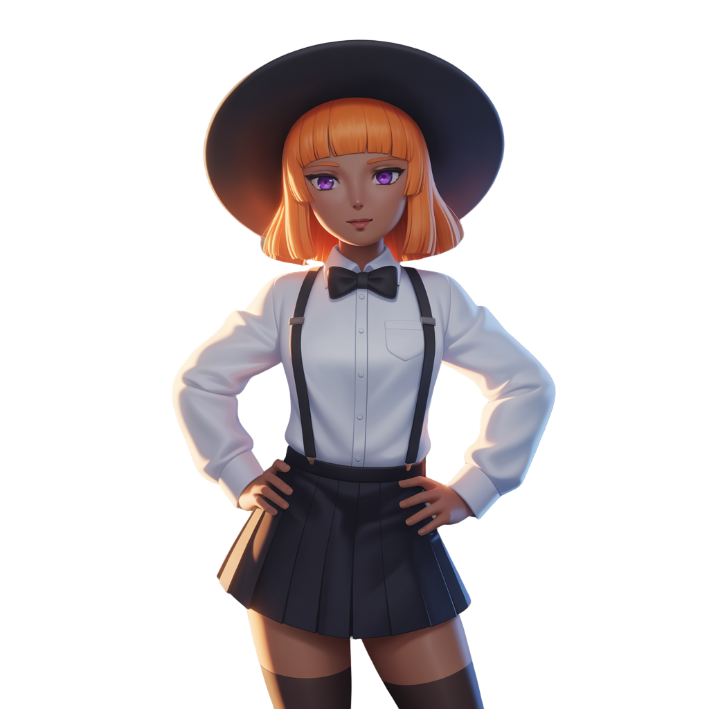 stylish anime girl with bright orange hair and vivid purple eyes. she wears a white dress shirt, black suspenders, a short pleated skirt, thigh-high stockings, and a wide-brimmed black hat. confident pose, soft lighting, detailed shading, dark skin