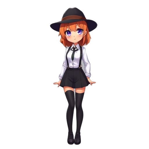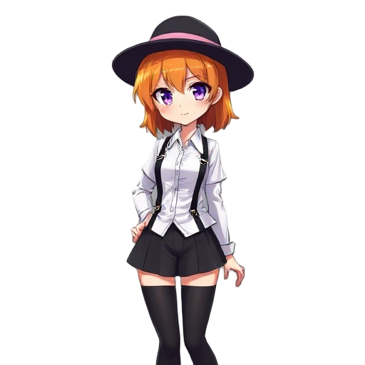 stylish anime girl with bright orange hair and vivid purple eyes. she wears a white dress shirt, black suspenders, a short pleated skirt, thigh-high stockings, and a wide-brimmed black hat. confident pose, soft lighting, detailed shading, modern anime aes